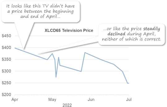 There’s another, more insidious problem with this chart: I’ve seen readers with less chart-reading experience interpret a chart like this to mean that, for example, the price of the TV steadily declined from $400 at the beginning of April to $350 at the end of April. That, for example, the price in mid-April was around $375. But it wasn’t; it was $400 that whole time.