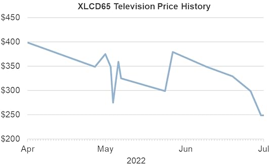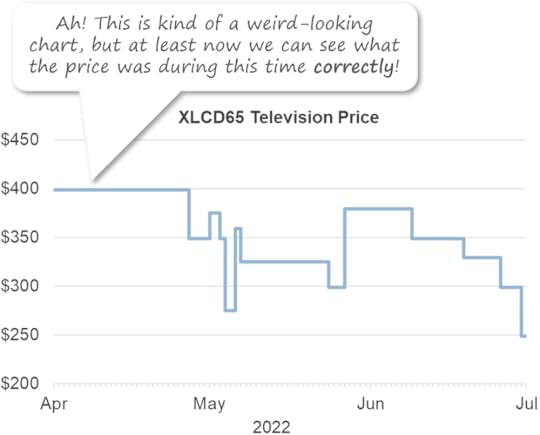 Hmmm. Some things about this chart don’t look quite right, do they? For example, it looks like the TV had a price at the beginning of April ($400) and then nothing until the end of April, when the price was $350. That’s not what happened, though. This TV did have a price between the beginning of April and the end of April: It was $400. Indeed, it had a price continuously throughout the entire period shown, but that’s not what this standard line chart suggests.
