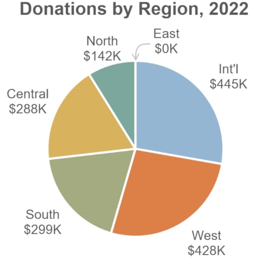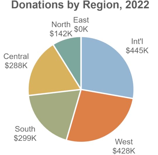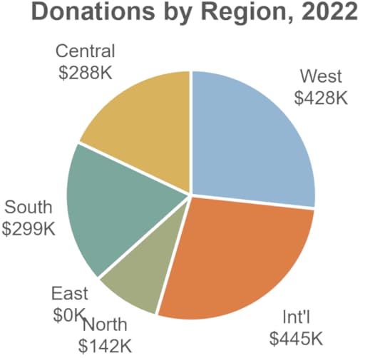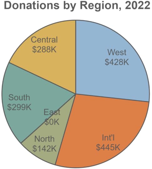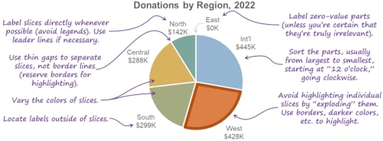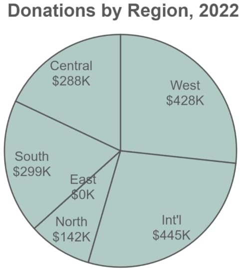 Regardless of what type of chart you’re creating, whenever you have non-sequential categories (such as the “region” categories in the pie chart above), it’s usually a good idea to sort them from largest to smallest (or, sometimes, smallest to largest), and this applies to pie charts, as well. In the pie chart above, the audience is probably most interested in the regions with the largest donations, so the regions should be sorted from largest to smallest. In a pie chart, sorting begins at the “12 o’clock” position and then moves clockwise, so the region with the highest donations starts at the 12 o’clock position, and the smaller regions appear after it in a clockwise direction.