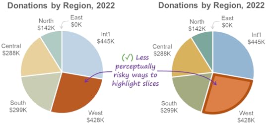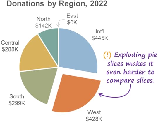 I avoid this technique because putting distance between pie slices makes it even harder for audiences to compare the sizes of the slices with the total or with one another. There are perceptually safer options for highlighting slices, such as using a color that’s darker than the rest of the palette or putting a border around slice(s) that you want to highlight: