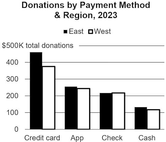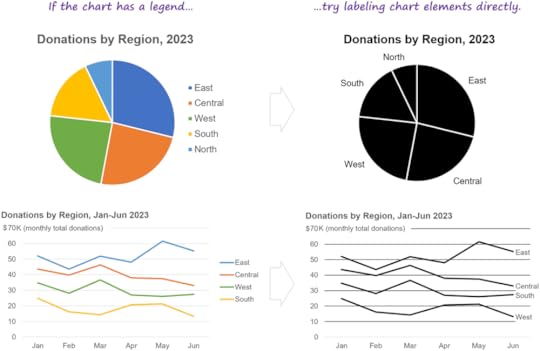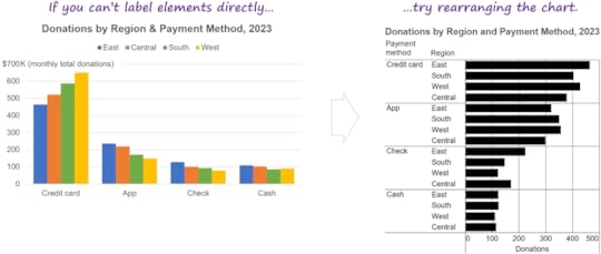 In my workshops, participants sometimes suggest removing the “East, $0” label altogether because they assume that the fact that it’s zero means that it’s unimportant. The fact that a value is zero doesn’t automatically mean that it’s unimportant, however. Maybe the East region was expected to have high donations, so the fact that it’s zero could be the single most important piece of information in this chart.
