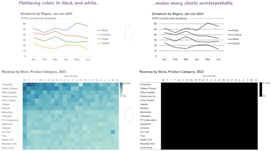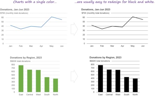 As you can see, black-and-white versions of charts are virtually always worse than color versions in a variety of ways. This is why I’m surprised when I occasionally meet chart designers who deliberately try to avoid using color in their charts. To me, that’s like trying to avoid using adjectives in your documents. If your target audience can read adjectives, your documents will be a lot clearer and easier to read if you use them.