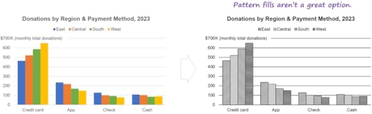 More visually busy than the color version? Yup. Harder to compare payment methods for a single region? You betcha. Like I said, most charts use color for a reason…