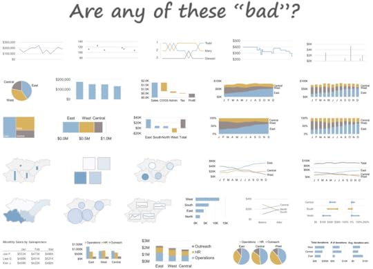 Does that mean that those chart types are “bad”? No, they’re all useful because they’re able to feature patterns and relationships within data. What I am suggesting is that, for those dozen or so chart types, alternative chart types are virtually always more informative, easier to read, less likely to misrepresent the underlying data, or some combination thereof. I don’t think those chart types are “bad”; I just think that there are better alternatives in virtually all situations, so there’s no reason to use them.