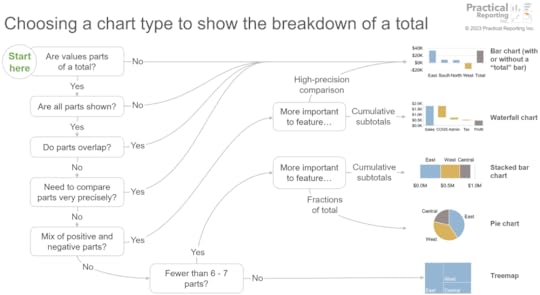 When choosing a chart type, it’s usually necessary to take six, seven or even ten decision factors into account. For example, the decision tree below from Practical Charts shows the eight factors that need to be taken into account when choosing a chart type to show the breakdown of a total: