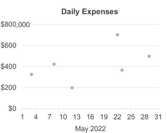 As a standard line chart, it looks like we know how Expenses changed during this time, but the reality is that we’re missing values for far too many days to know what the actual pattern of change was. In order to avoid showing patterns that don’t actually exist, then, we’d need to use a dot plot instead of a standard line chart: