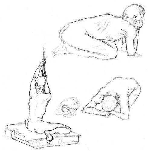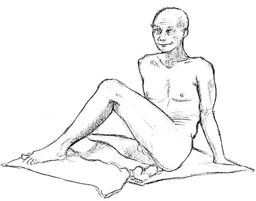 My first experience with figure drawing was in 2001, when I tagged along with a coworker to a cheap class ($3) at San Jose State University. Throughout the class I tried to make my buddy laugh by only drawing the model's penis again and again, with plenty of wrinkly detail. This almost exploded in my face (so to speak) when the model cozied over to me and tried to simultaneously flirt and catch a glimpse of what I was drawing (I covered it up and stammered that I was embarrassed by my drawing...