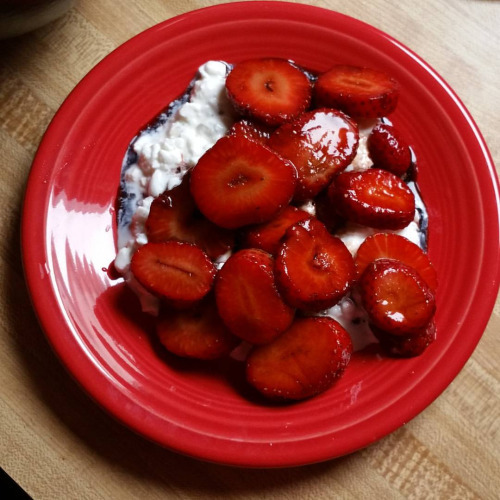 Today’s breakfast (brunch): strawberries in vinegar on a bed of cottage cheese! (at K T Pinto-Land)