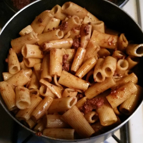 Rigatoni and chopped meat! Yum! (at K T Pinto-Land)