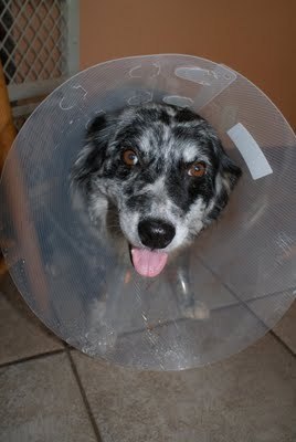 She may be a camera ham, but Trim is very, very unhappy about sporting The Cone of Shame.