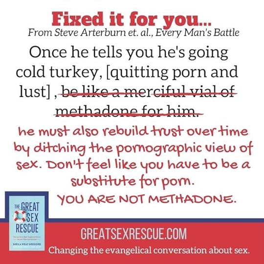 But in the meantime, let’s remember that she is not the methadone for his porn addiction, no matter what books like Every Man’s Battle say. She is a precious person, made in the image of God, and she doesn’t deserve to be reduced to a masturbatory aid so that he doesn’t sin. And sex, which God created to be beautiful and intimate, should not be reduced to pure sin management in a dehumanizing way.