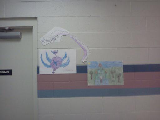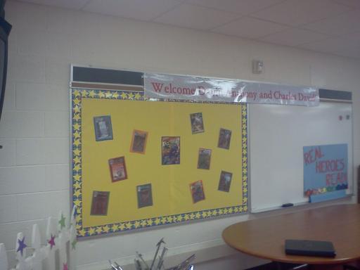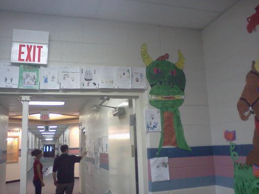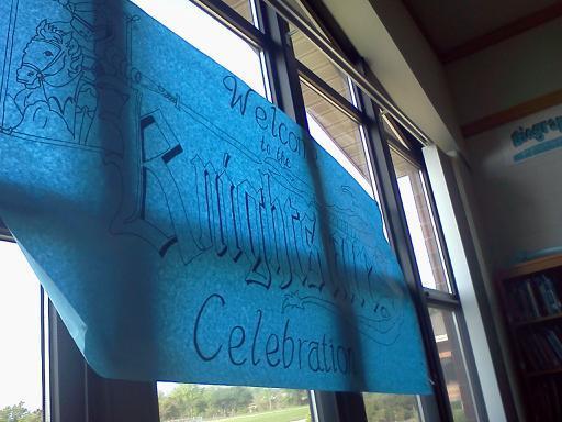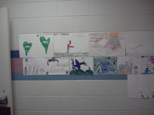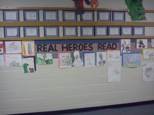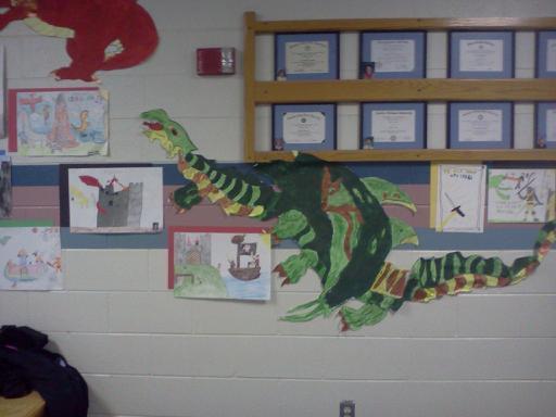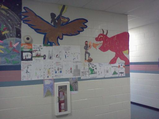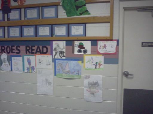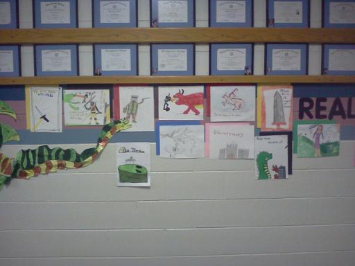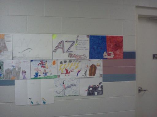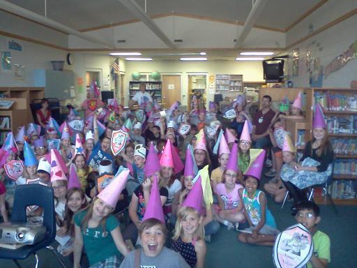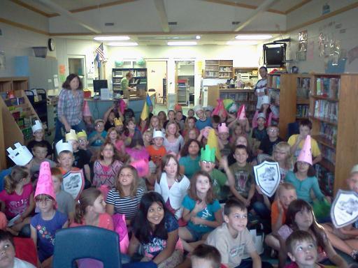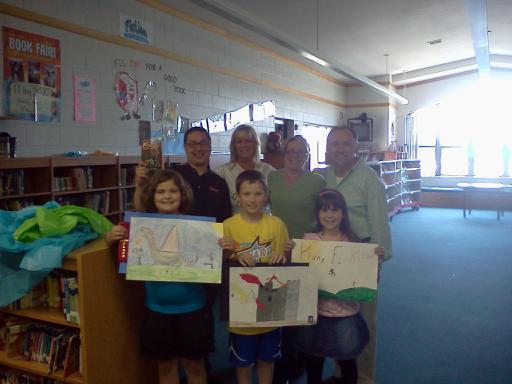 Friday May 18, 2012 wasn’t the typical school visit for us. Charlie and I arrived at Central Elementary in Vassar, Michigan at 8:30 am. So far, so normal. What we saw when the students arrived for our first presentation, however, delighted us. The kids came in costume! Some clutched shields adorned with the Vassar Vulcan like medieval knights. Many wore crowns or princess hats. See for yourself in the pictures below. What a great group of kids and teachers for putting that together. Nice surprise! But wait, the excitement wasn’t over yet. The students had also decorated the walls of Central with drawings inspired by our Knightscares and Heroes A2Z books. We tried to photograph them all. Hope we got ‘em. Finally, we enjoyed a delicious lunch with Principal Phil Marcy at a local cafe. Good stuff! Thanks to 5th grade teacher Ann Auernhamer and Librarian Pam Aranyos for inviting us!