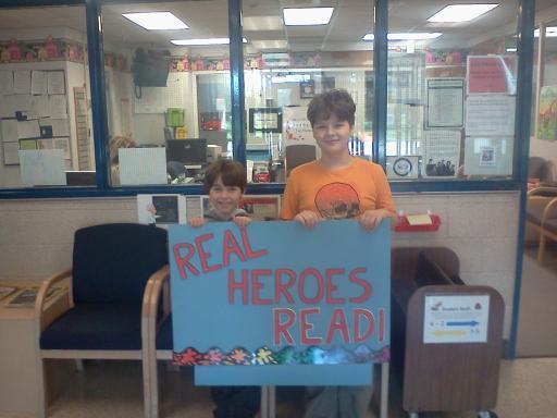Super school visit today, April 17, 2012! Costello Elementary in Troy, Michigan has it all. As soon as we arrived this morning, we were greeted by two super fans holding a Real Heroes Read poster (pictured above). Nice way to start the day. Next Media Specialist Wendy Gustin served as the perfect hostess. She planned a flexible schedule, provided a delicious lunch (Fritos for the win!), and even found Charlie some juggling balls. That’s what we get for giving them all away! Best of all, the students and teachers seemed to really enjoy our presentations (all FOUR of them–whew!). One teacher, who will remain anonymous (because her name sounds like a ferocious critter that lives in the woods), watched our show THREE TIMES! I think we made a reader out of her. Of course that’s no surprise at Costello. The school is filled with reading heroes!