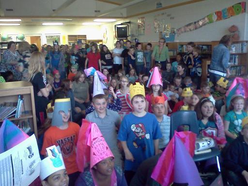 On Friday April 20, 2012, Charlie and I visited Graham Elementary in Auburn Hills, Michigan. The school is located very close to the Pontiac Silverdome where the Detroit Lions played football for so many years. In honor of that, we gave 110% (what kind of math is that?!) for four quarters. Actually, make that four shows–one with the morning kindergarten, one with the 1st and 2nd graders, one with the afternoon K, and one with third through fifth graders. With the expert coaching of Media Specialist Linda Lindemann, we kept the fans (students) on their feet (seats) whether they were wide-eyed rookies (kindergarten) or crafty veterans (fifth grade). Thank you Graham for being reading champions and for making our visit a blow-out victory!