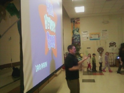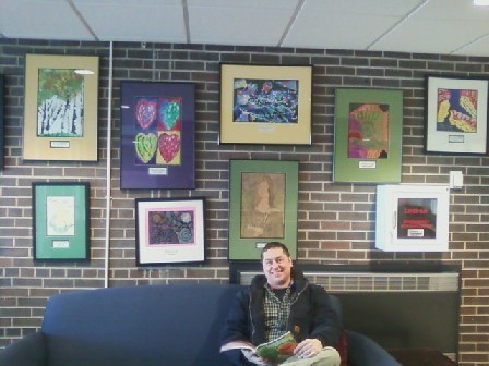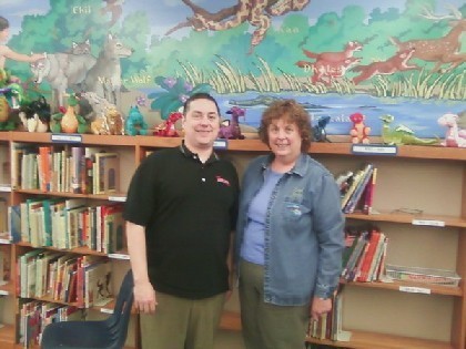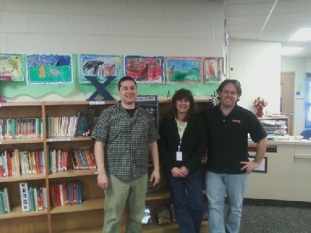 Why is Charlie sitting all alone in the lobby of Willow Woods Elementary (Go, Wildcats!) in Sterling Heights? Because the school was a ghost town on our visit today. At least in the number of normal teachers there. Today the school was staffed by substitute teacher after substitute teacher. Why? Conferences and–yikes!–the dreaded flu. Even our hostess, media specialist Lisa Kennedy, was out sick for the day. Bummer! She and the other absent teachers missed a great afternoon. Lucky for us...