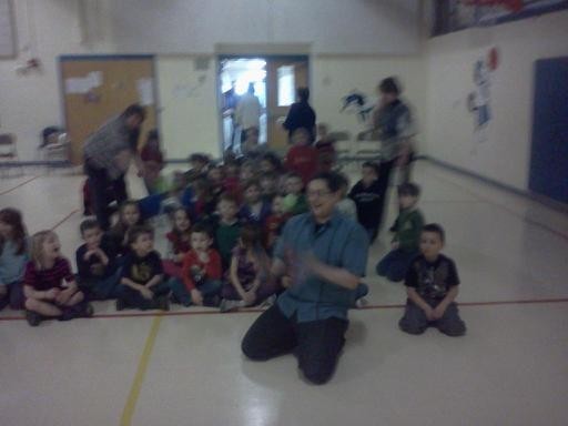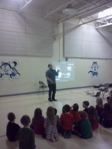 Today, February 27, 2012, Charlie and I visited two elementary schools in Hemlock, Michigan. First we met with the kindergartners and first graders at Hemlock Elementary. (Wonder where the school got its name?!) Can you guess the school's mascot? No, not Charlie! He's a visiting author. Look behind him on the walls. There's an athletic husky dog showing the kids how to have fun in gym class.
