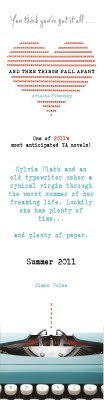 So below is a sensational little book trailer for And Then Things Fall Apart that someone other than me made. I came upon it quite on accident and I think it is totally cool! I might try and make one myself on animoto. Or maybe on imovie, or I dunno. I didn't think I needed one but I think it might me kind of fun to actually make one! And I will do anything except write a new book so. There was some acclaimed writer of note whose name I don't remember who famously outfitted his writing chair with a seatbelt and would STRAP HIMSELF IN to write. It's not that I don't love writing. Oh- we are in love, writing and I- it's just--- well. Stay tuned...
