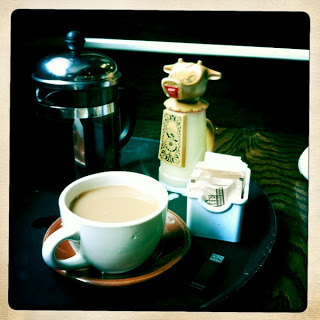 I go to the bathroom and put lipstick on.I get a coffee, sometimes with a little cow.