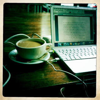I find a table either by the window or in the corner by the kitchen.I take a picture of my coffee and tweet it.I open up my Macintosh device collection of iphone, ipod touch, and the laptop that will not die.I find a good station on Pandora- Lou Reed or David Bowie (they fit this book best so far).