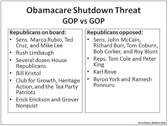 On the former, I think it's safe to say the unhinged wing of the GOP is going to be disappointed. To actually shut down the government because Democrats refused to take health care away from millions of struggling families is, for lack of a better word, hopelessly insane, and to pull this off, Republicans would need a united front. As the above image should help reinforce, these guys are anything but united.
