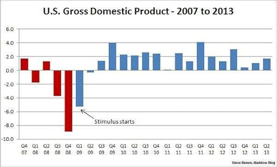 Of course, this morning's report would have shown GDP growth over 2% had it not been for reductions in government spending, mandated by conservative policymakers who believe the recovery will be stronger if they weaken it by taking capital out of the economy. The caveat to this is that conservative austerity measures at the state and local levels appears to have come to an end, which helps mitigate the deliberate damage done by congressional Republicans.