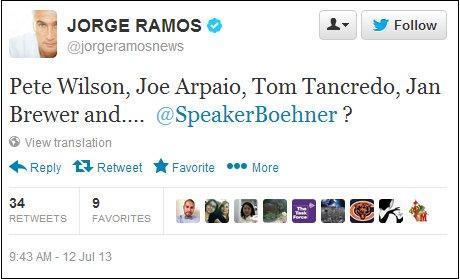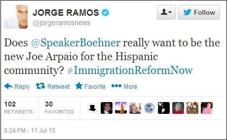 Univision's Jorge Ramos delivered this message last night to his 912,000 Twitter followers, connecting House Speaker John Boehner (R-Ohio) to anti-immigrant sheriff Joe Arpaio in the minds of the Hispanic community. Following up on that message, Ramos added this tweet this morning: