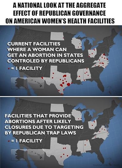 But taken collectively, the national significance of state-level Republican anti-abortion legislative activism is clear. Where American women nationally voted overwhelmingly (55% to 44%, with the largest gender gap in Gallup poll history) against the Republican candidate who said he would be "delighted" to sign a federal abortion ban into law, what American women in Republican controlled states are actually getting since the 2012 election is a drastic dismantling of their reproductive rights.