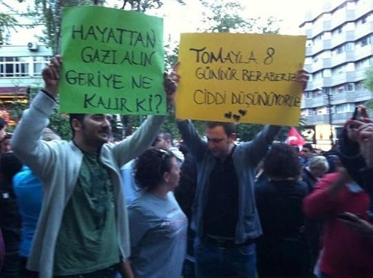 The guy next to him is holding a green sign saying: Without (tear) gas, what remains? Life just isn't the same. (H/T Selen Koksal for the translations.)