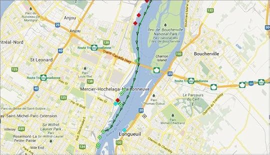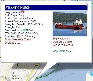 So when observers see a ship called the Atlantic Huron being loaded up with the Koch's coke, they enter the name and track it. One of the options in the vessel's search result is "Show Vessel's Track" and clicking that gives you a green line that shows roughly a day's worth of travel. When I looked yesterday, the green like started at the mouth of the St. Lawrence River and when down to Quebec City. Right now it looks like it's docked in Montreal.