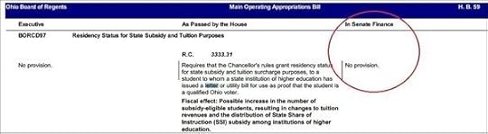 And it's true. If you dial up the comparison of the two budget versions -- old House and new Senate -- you'll see that where the House had the part about tuition and voting, the Senate has "no provision." It's on numbered page 554 482, the seventh mention of "letter." (P.S. Last week Ohio Republicans said they're still interested in curbing the student vote, just not in the budget.)