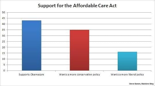 I put together this chart to help drive the point home -- 43% support "Obamacare," which isn't that bad, all things considered. But while a majority of the country opposes the law, there's a major disagreement among them -- 35% of opponents believe it's too liberal and prefer a more conservative law, but 16% of opponents believe the Affordable Care Act is too conservative and wish it had gone further.