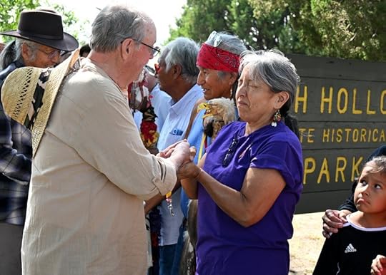 Then I rode over the ridge and the others after me, and we were crying: “Take courage! It is time to fight!” The soldiers who were guarding our relatives shot at us and then ran away fast, and some more cavalrymen on the other side of the gulch did too. We got our relatives and sent them across the ridge to the northwest where they would be safe.I had no gun, and when we were charging, I just held the sacred bow out in front of me with my right hand. The bullets did not hit us at all.