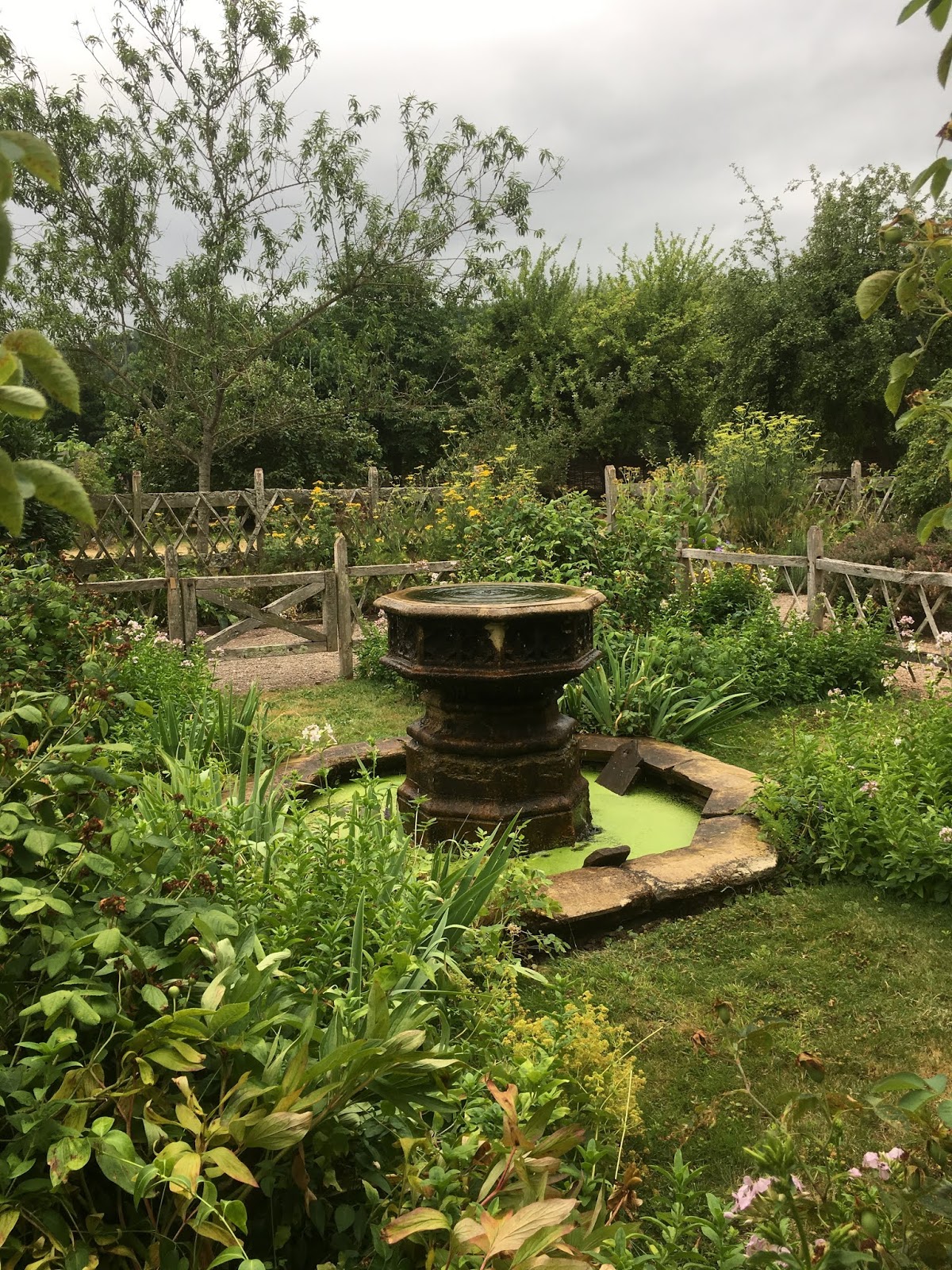 The garden with its relaxed medieval planting is as beautiful as any I have seen is this country. Laid out and designed by Francesca Kay, it has a covered walk way, tumbling with red and white roses, fragrant lavender, aquilega, foxgloves and marigold sprawl beside a bubbling fountain in the midst of a chequered lawn.
