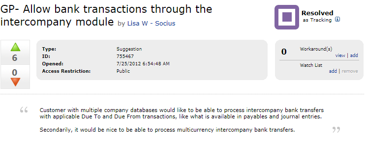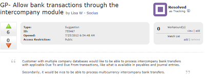 We're going back to banking for this week's new feature that we want to see in Dynamics GP - Intercompany Bank Transactions. This is something I would really like to see in GP. If you agree, please follow the link to vote.
