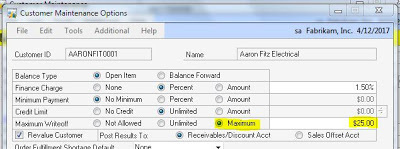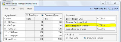 At some point though you'll need to write off something larger. A great way to do this is to add a password to exceed the maximum write off. This is set in Receivables Setup.
