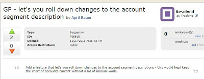 This week's suggestion revolves around the chart of accounts. If you use segment descriptions and allow them to populate the chart descriptions you can get a really clean chart of accounts. But what happens if something changes? For example, you thought that a main segment description of "Receivables, Accounts" was a good idea until you realized that now no one can ever find the account by description. Users are disgruntled, the natives have pitchforks in their cubes. Today you have to go to each account and fix it or use SQL to clean things up. It would be pretty cool if you could change the segment description and have it roll down to the chart.
