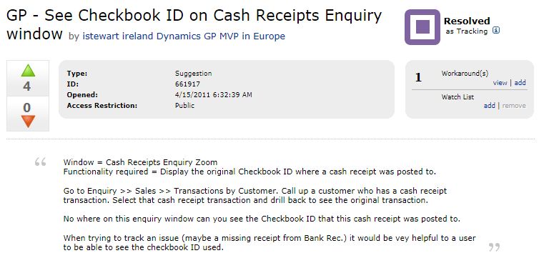 https://connect.microsoft.com/dynamicssuggestions/feedback/details/661917/gp-see-checkbook-id-on-cash-receipts-enquiry-window