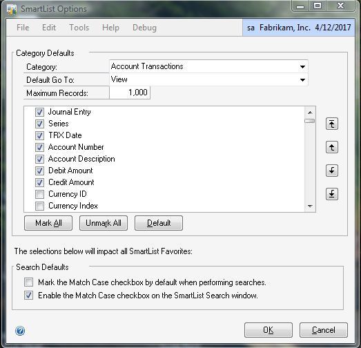 The SmartList Options window will open. This is a place where an administrator can change the SmartList defaults. Find a default SmartList like Account Transactions and swap credit amount and debit amount. Remove those fields you don't use and add ones you constantly have to lookup. Don't settle, take control of SmartLists!
