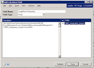 I grabbed the entire parameter string AFTER the first equal sign (=). I would need that for the parameter later. Created a calculation in SmartList builder using the calculation button and pasted the parameter string in as a calculation with single quotes around it for SQL. Then I added a plus sign (+) and selected the invoice number from the available fields at the right. This gave me almost the entire parameter string. The calculation looked like this: