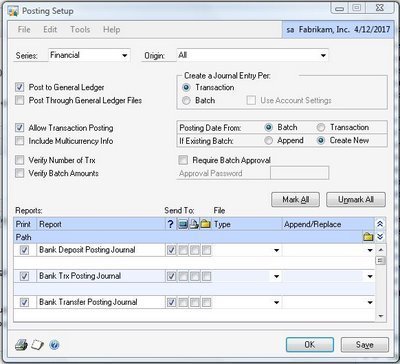 The fun really starts when a firm decides that they want everything to post to and through the GL. The way to set this is via the Dynamics GP menu then Tools->Setup->Posting->Posting, Select a Series (like financial), set Origin to ALL and check both the Post to General Ledger and Post Through General Ledger checkboxes. Click save to make the change stick and then repeat this for each series.
