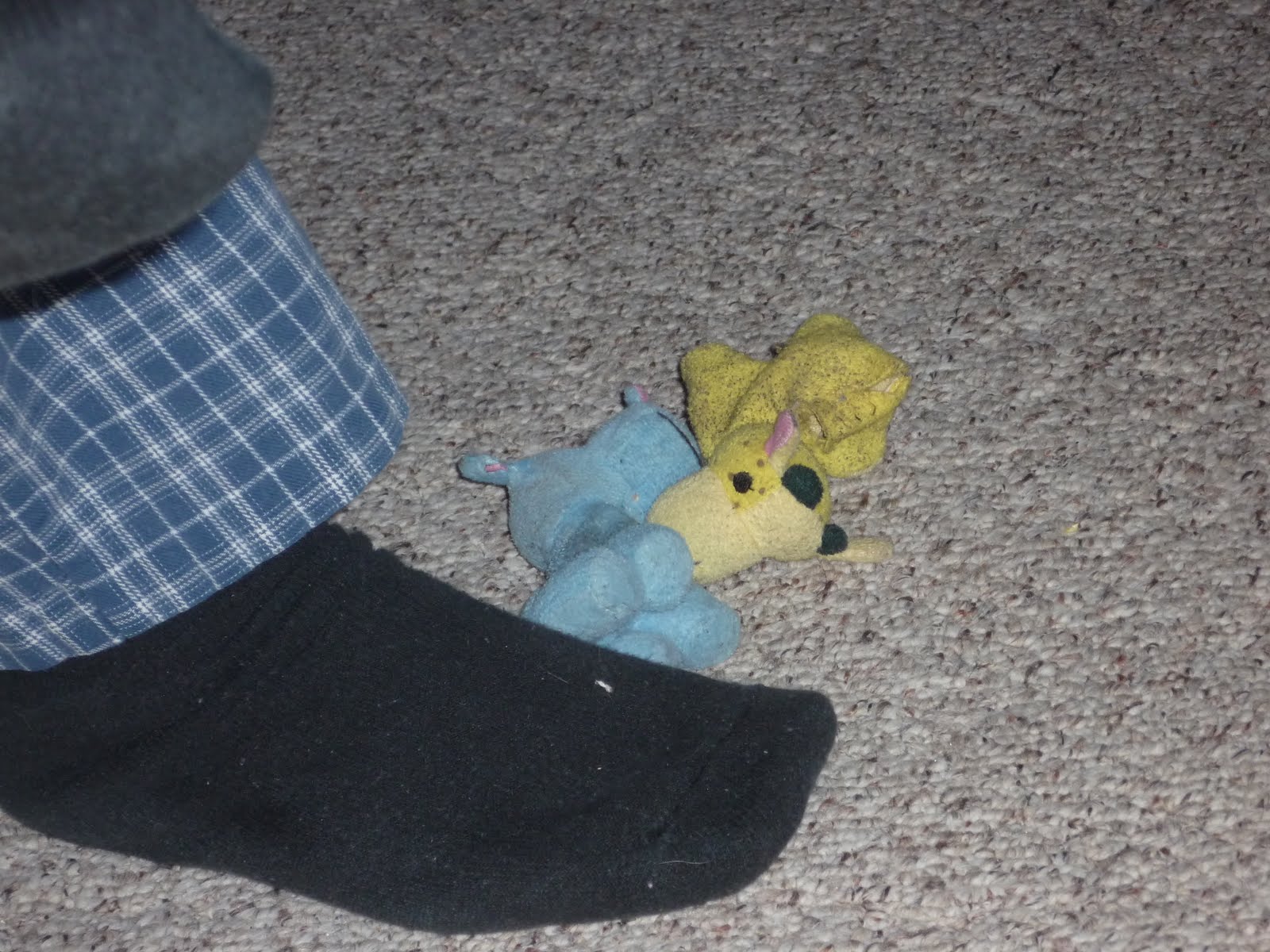 This is Ellie the Giraffe and Hooey the Hippo. Hooey spends a great deal of time flying through the air, while Ellie has been nearly unstuffed. Fiona loves them both though and it appears they love each other as well.