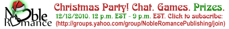 Come on by the Noble Romance Publishing Reader Christmas Party and you could win some nice prizes. We'll have a grand prize package each hour and every attendee will get a FREE Noble Holiday Nibble e-Cookbook, loaded with recipes from some of your favorite Noble Romance authors.