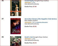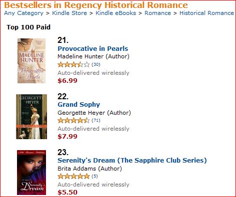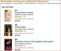 Well, not having enough of the exploration, I searched the Kindle Store. There she was again, Ms. Serenity lurking just below Madeline Hunter and Georgette Heyer in the #23 slot. Out of over 6600 Historical Regencies in the Kindle store, Serenity's sits close to the top. The feeling to see that is amazing for many reasons no one but me will ever understand, but it is wonderful.
