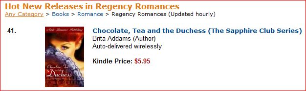 A search of the Hot New Releases on Amazon revealed Chocolate, Tea and the Duchess in the #41 slot. She's hovered there for several days, making me very proud of her. She and the others compete with Lisa Kleypas, Mary Balogh, Georgette Heyer, even Jane Austin, and still make the category lists. Stellar company I'd say.