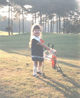 In 1986, she became the New Orleans March of Dimes Youth Ambassador (Poster child,) a position she held for six years. Below, you see her at a golf tournament, where she entertained and charmed everyone. You can't see the badge she wore, but it was a big blue button that said March Of Dimes. The doctor who delivered her was there and after years of guilt on his part, though he had nothing to do with Lindsay's disability (it isn't contracted at birth and nothing that can be prevented,) he got to see her and talk to her and know that she was doing well.
