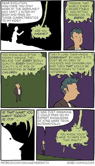Hovertext:If humans passed on traits acquired in their 20s, each generation would be exponentially more stressed forever.