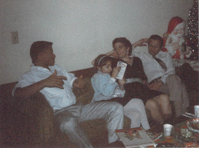Richard Cody and his wife had a huge network of extended family and friends, former students, children biological, foster, and adopted, and so on and so forth. We'd enjoy Christmas carols around the piano (often with me or my mom playing), orange sherbet punch, and a reading of The Night Before Christmas that culminated in Santa coming down the stairs and handing presents out to all the kids. When I was little, Santa was this really tall man named Benjamin, and then his son Malik inherited the post--that might be him on the left in the picture, or possibly his brother Ibi. (Clearly nobody was alarmed by Santa suddenly changing from white to black in the space of a year.)