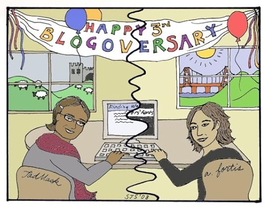 Three years in, I posted a cartoon of THE TWO OF US in our imaginary writing spaces--Tanita was still in Scotland, as evidenced by the sheep and castle, and I apparently lived within sight of the Golden Gate Bridge (which is a wee 90-mile exaggeration):