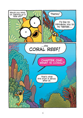 Click to embiggen. Image courtesy of Macmillan.The narrator of the story is a little yellow prawn-goby, a tiny fish that lives in coral reefs. Unlike with Nemo, there's no need to resort to a family tragedy in order to feel sympathetic to this little guy. Our goby friend is ready with a smiling face and intellectual hipster glasses, well suited to the task of zipping here and there in the reef and doing the heavy lifting of breaking down the chemistry, biology, and ecology of ocean life. The artwork is simple when it needs to be, and more complex and scientifically accurate when called for, without losing a consistent colorful charm throughout. The book also contains some supplemental educational material, giving it additional heft for classroom use: a glossary, of course; a bibliography and list of resources; and an in-depth diagram of a coral polyp.