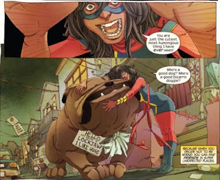click to embiggenThis episode also focuses, for its moral message (because don't superhero comics usually have one? I find they do), on youth issues and the empowerment of the current generation beyond the stereotype of them being clueless, apathetic drones with smartphones grafted onto their hands. If you think about it, superhero comics have often been message-y, so I'm not going to pass judgment on that aspect because it just is what it is, but I will say that it's a message well suited to an audience of young readers, and I like the idea of this comic being able to appeal to a wide range of readers and interest a new generation in traditional comic-book heroes. Honestly, what's not to like? A butt-kicking girl hero, plenty of diversity, lots of humor and hilarity, and a giant, lovable, slobbering telepathic dog. Go read it.One other thing which I didn't notice before that I just adored: Ms. Marvel's outfit. If you look carefully at it, it's actually a shalwar kameez, and instead of a cape she has a dupatta (shawl). It's pretty awesome, and it's featured prominently on the cover of this collection. The cultural aspects are well done, again, in this episode, and readers not as familiar with Pakistani culture or with Islam will see typical family interactions and learn, for instance, that dogs aren't considered to be clean animals you'd let live in your house. (This was a Thing when I was a kid, and as a kid who wanted a dog, it was not a thing I liked. However, having been to India since then, and seeing the sheer number of stray dogs all over the place, I kind of understand it more…) There's also a GREAT visit by Kamala to her imam at the mosque, who gives her very wise advice. Another really important scene, to me, given the number of people who have no idea what an imam really is or does beyond what they see on TV.